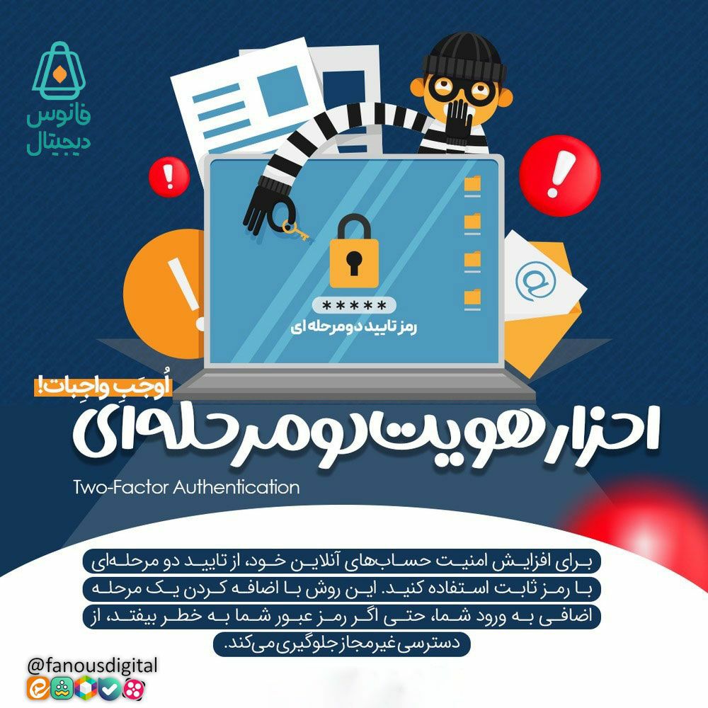 🔐 برای افزایش امنیت حسابهای آنلاین خود، از تایید دو مرحلهای با رمز ثابت استفاده کنید. این روش با اضافه کردن یک لایه امنیتی اضافی به فرآیند ورود شما، حتی اگر رمز عبور شما به خطر بیفتد، از دسترسی غیرمجاز به حسابتان جلوگیری میکند. ⚠️ تایید دو مرحلهای باعث میشود که حتی در صورت لو رفتن رمز عبور، فرد مهاجم نتواند به حساب شما دسترسی پیدا کند. 🔒 این ویژگی بهویژه برای حسابهای بانکی، ایمیل و شبکههای اجتماعی بسیار ضروری است. ✅ همیشه امنیت آنلاین خود را با این روش تقویت کنید و از خطرات احتمالی جلوگیری کنید!