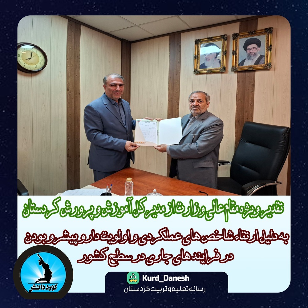 به گزارش اداره اطلاع رسانی و روابط عمومی آموزش و پرورش کردستان، وزیر آموزش و پرورش طی دیداری رسمی در حاشیه اجلاس مدیران کل در اردوگاه شهید باهنر تهران ، از تلاشهای مدیرکل آموزش و پرورش استان کردستان تقدیر و تشکر ویژه بهعمل آورد. این تقدیر در پی دستاوردهای قابلتوجه استان در ارتقاء شاخصهای عملکردی و مدیریت اثربخش فرآیندهای آموزشی صورت گرفت.در این دیدار رسمی مدیرکل آموزش و پرورش کردستان گزارشی جامع از فعالیتهای آموزش و پرورش استان در محورهایی چون نهضت توسعه عدالت در فضاهای آموزشی با تمرکز بر مناطق محروم ، افزایش کیفیت آموزشی در دورههای ابتدایی و متوسطه، پروژه مهر و آمادهسازی زیرساختهای آغاز سال تحصیلی ، ثبتنام دانشآموزان و کسب رتبه سوم کشوری در ثبتنام پایه اول ابتدایی، رتبه اول کشوری در ثبتنام پایه هفتم دوره متوسطه اول، کسب رتبه سوم کشوری در تصحیح اوراق امتحانات نهایی، ثبت سفارش و توزیع کتب درسی با کسب رتبه برتر، توزیع سهمیه کلاسی و نهایتا ساماندهی نیروی انسانی بر اساس عدالت آموزشی و نیازهای منطقهای را ارائه دادکاظمی وزیر آموزش و پرورش نیز با اشاره به این اقدامات، موفقیتهای کردستان را نمونهای برجسته از مدیریت جهادی، برنامهریزی مبتنی بر شاخص، و توجه به عدالت آموزشی دانست و از تلاشهای مدیرکل، اعضای شورای معاونین استان و مجموعه مدیران، معلمان، و کارکنان آموزش و پرورش استان تقدیر کرد.در پایان این دیدار لوح تقدیر ویژهای از سوی مقام عالی وزارت به مدیرکل آموزش و پرورش کردستان اهدا شد، و بر ادامه این مسیر تحولآفرین تأکید شد.