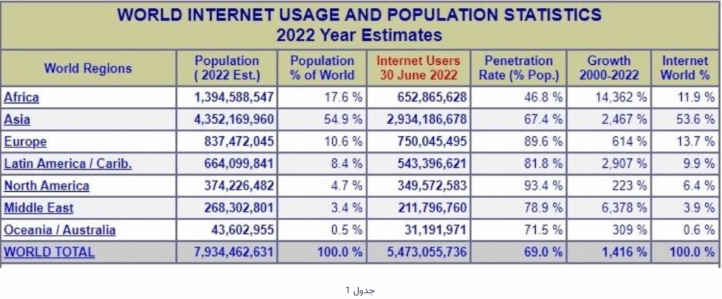 - مناطق جغرافیایی: بهطور معمول افراد در شهرها و بهویژه در کلانشهرها بیشتر از روستاها از اینترنت و ابزارهای دیجیتالی بهره میبرند. اگرچه امروزه در بسیاری از مناطق روستایی در جهان و ایران از اینترنت برخوردار هستند، اما در برخی نقاط، اینترنت هنوز برای انجام کارهای حرفهای مناسب نیست و هنوز در شهرهای بزرگ، مشاغل، دانشگاهها و ادارات، بهنسبت، مصرف اینترنت بسیار بیشتری دارند تا روستاها. دسترسی به ابزارهای مدرن، بین قاره ها و کشورهای مختلف هم متفاوت است. یکی از بزرگترین شکافهای دیجیتالی، بین کشورهای توسعهیافته و درحالتوسعه دیده میشود. بهگونهای که در در قاره آمریکای شمالی ضریب نفوذ اینترنت ۹۳.۴ درصد است، در حالی که در آفریقا این رقم ۴۶.۸ درصد است. در جدول ۱، آمار قارههای مختلف، بهلحاظ جمعیت، نسبت جمعیت به جمعیت کل دنیا، تعداد کاربران، ضریب نفوذ اینترنت، درصد رشد از سال ۲۰۰۰ تا ۲۰۲۲ و درصد سهم هر قاره از اینترنت جهان آمده است.