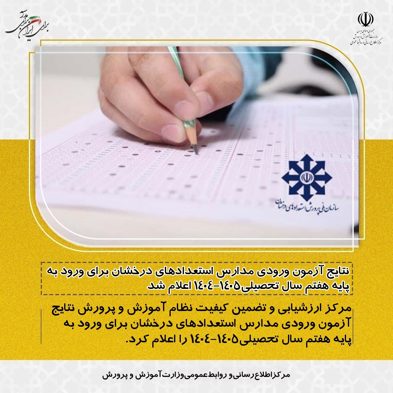 نتایج آزمون ورودی مدارس استعدادهای درخشان برای ورود به پایه هفتم سال تحصیلی۱۴۰۵-۱۴۰۴ اعلام شد.